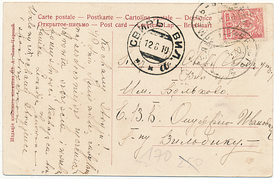 Pocztówka Pińsk obieg ambulans pocztowy postkarte Pinsk postcard Pinsk открытка Пінск z obiegu 1910r stempel ambulans pocztowy pocztówki Kresy wschodnie pocztówki z kresów Kresy na starych pocztówkach postkarte Weissrussland postcard Belarus Открытки Беларуси