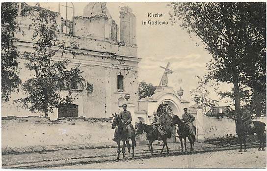 Pocztówka Godlewo Kościół wojsko konie postkarte Goddlau Godlewo postcard Garliava открытка Гарлява pocztówki Kresy wschodnie pocztówki z kresów Kresy na starych pocztówkach