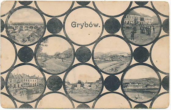 Lekkie zgięcie. Pocztówka Grybów Kilka widoków postkarte Grünberg postcard Gribuv открытка Грыбув, Грибів z obiegu 1909r
