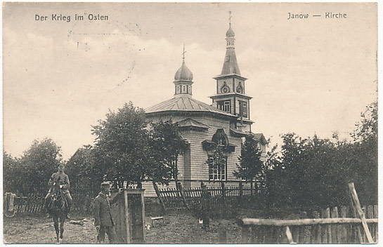 Pocztówka Janow Jonava Cerkiew wojsko postkarte Janau Der Kreig im Osten Orthodoxe Kirchenbauten postcard Jonava Cerkvė Orthodox church открытка Ионава Православный храм церковь pocztówki Kresy wschodnie pocztówki z kresów Kresy na starych pocztówkach