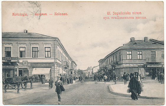 Pocztówka Kołomyja Ulica Jagiellońska niższa postkarte Kolomea postcard Kolomyia Kolomyya открытка Коломия Коломыя pocztówki Kresy wschodnie  pocztówki z kresów Kresy na starych pocztówkach