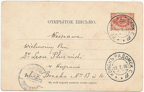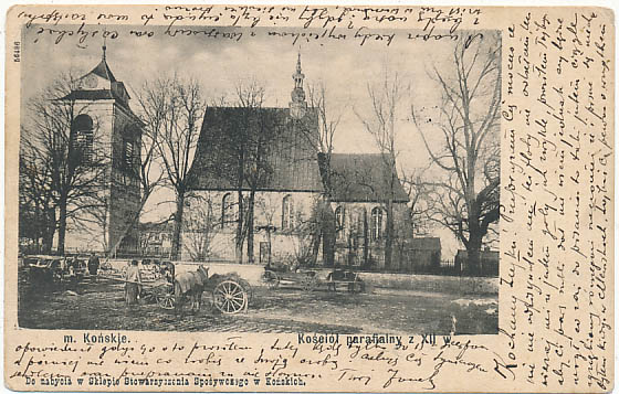 Pocztówka Końskie Kościół parafiany postkarte Końskie postcard Końskie открытка Коньске z obiegu 1905r pocztówka dlugi adres