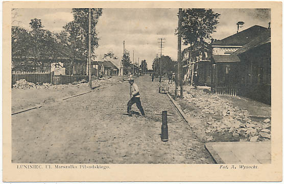 Pocztówka Łuniniec Ulica Piłsudskiego postkarte Luninez weißrussisch postcard Luninets открытка Лунінец Лунинец pocztówki Kresy wschodnie pocztówki z kresów Kresy na starych pocztówkach postkarte Weissrussland postcard Belarus Открытки Беларуси