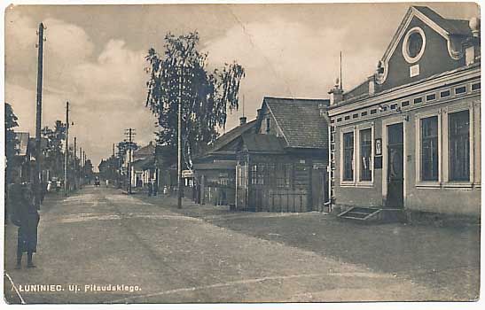 Lekkie zgięcia. Pocztówka Łuniniec Ulica Piłsudskiego postkarte Luninez weißrussisch postcard Luninets открытка Лунінец Лунинец pocztówki Kresy wschodnie pocztówki z kresów Kresy na starych pocztówkach postkarte Weissrussland postcard Belarus Открытки Беларуси