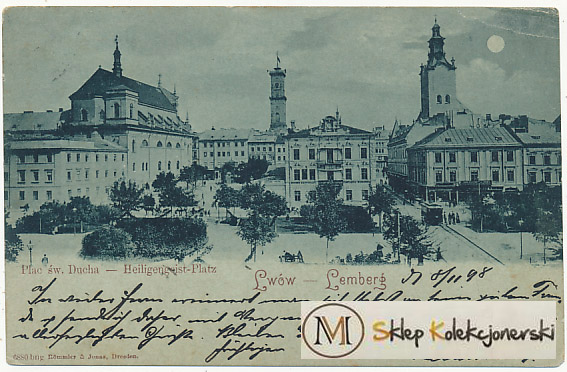 Zgiety róg. Pocztówka Lwów Plac św. Ducha, postkarte Lemberg, postcard Lviv, открытка Львів, Львов, pocztówki Kresy wschodnie, pocztówki z kresów, Kresy na starych pocztówkach, pocztówki długi adres