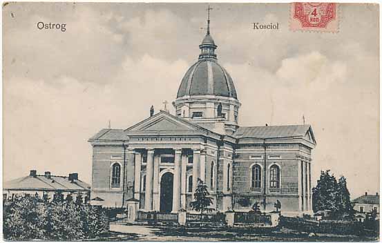 Pocztówka Ostróg Kościół postkarte Ostroh postcard Ostroh открытка Острог z obiegu 1908r pocztówki Kresy wschodnie pocztówki z kresów Kresy na starych pocztówkach