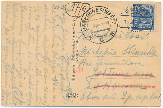 Zgięty róg. Pocztówka Rymanów Zdrój, postkarte Reimannshau, postcard Rymaniv, открытка Рыманув, Риманів