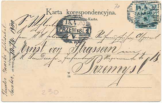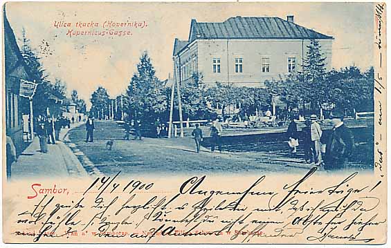Pocztówka Sambor ulica Kopernika postkarte Sambir postcard Sambir открытка Самбор z obiegu 1900r długi adres pocztówki Kresy wschodnie  pocztówki z kresów Kresy na starych pocztówkach