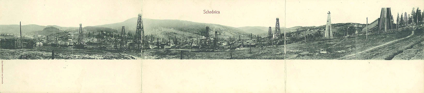 Ślad odklejania. Ciekawa potrójna pocztówka Schodnica Borysław szyby naftowe postkarte Borislau postcard Boryslav открытка Борислав wydawca jan Bromilski Lwów bez obiegu