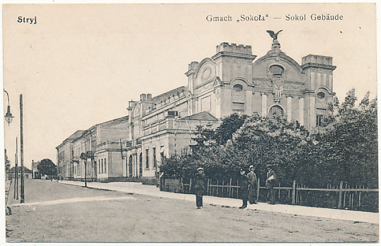 Pocztówka Stryj Gmach Sokoła Sokół postkarte Stryj postcard Stryi открытка Стрый  bez obiegu. pocztówki Kresy wschodnie pocztówki z kresów Kresy na starych pocztówkach
