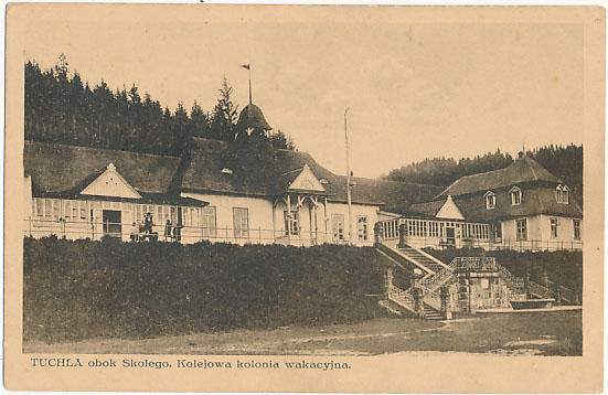 Pocztówka Tuchla Kolejowa kolonia wakacyjna postkarte Tuchla postcard Tuchla открытка Тyxля pocztówki Kresy wschodnie pocztówki z kresów Kresy na starych pocztówkach