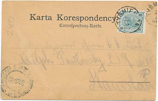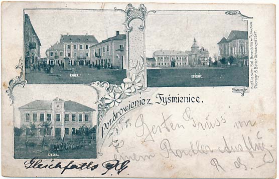 Zgięcie wzdłuż pocztówki. Pocztówka Tyśmienica postkarte Tysmenyzja postcard Tysmenytsia открытка Тысменица z obiegu 1900r długi adres pocztówki Kresy wschodnie pocztówki z kresów Kresy na starych pocztówkach